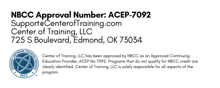 Center of Training, LLC has been approved by NBCC as an Approved Continuing Education Provider, ACEP No. 7092. Programs that do not qualify for NBCC credit are clearly identified. Center of Training, LLC is solely responsible for all aspects of the program.